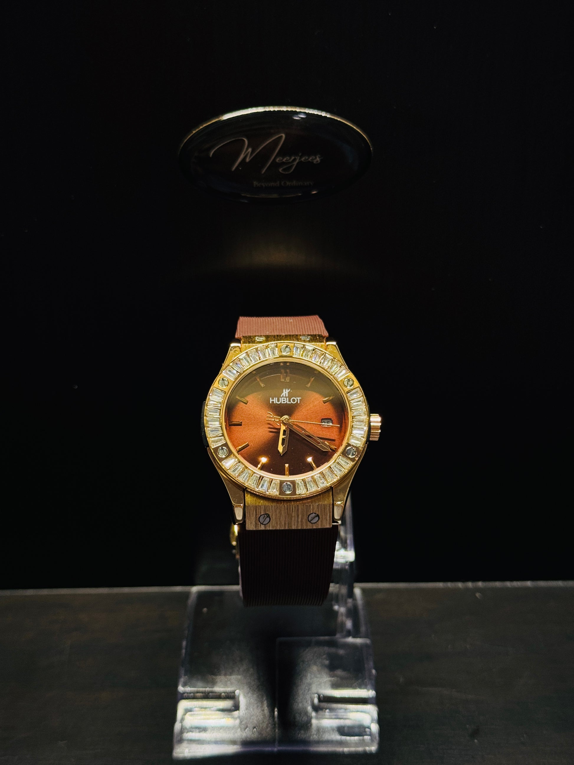 A masterpiece of color and class, the Hublot Burgundy Crystal Bezel stuns with its radiant maroon dial, gold-plated frame, and crystal-set bezel. The soft velvet strap wraps around the wrist like royalty, making it the perfect go-to timepiece for ladies who refuse to settle for anything less than attention.