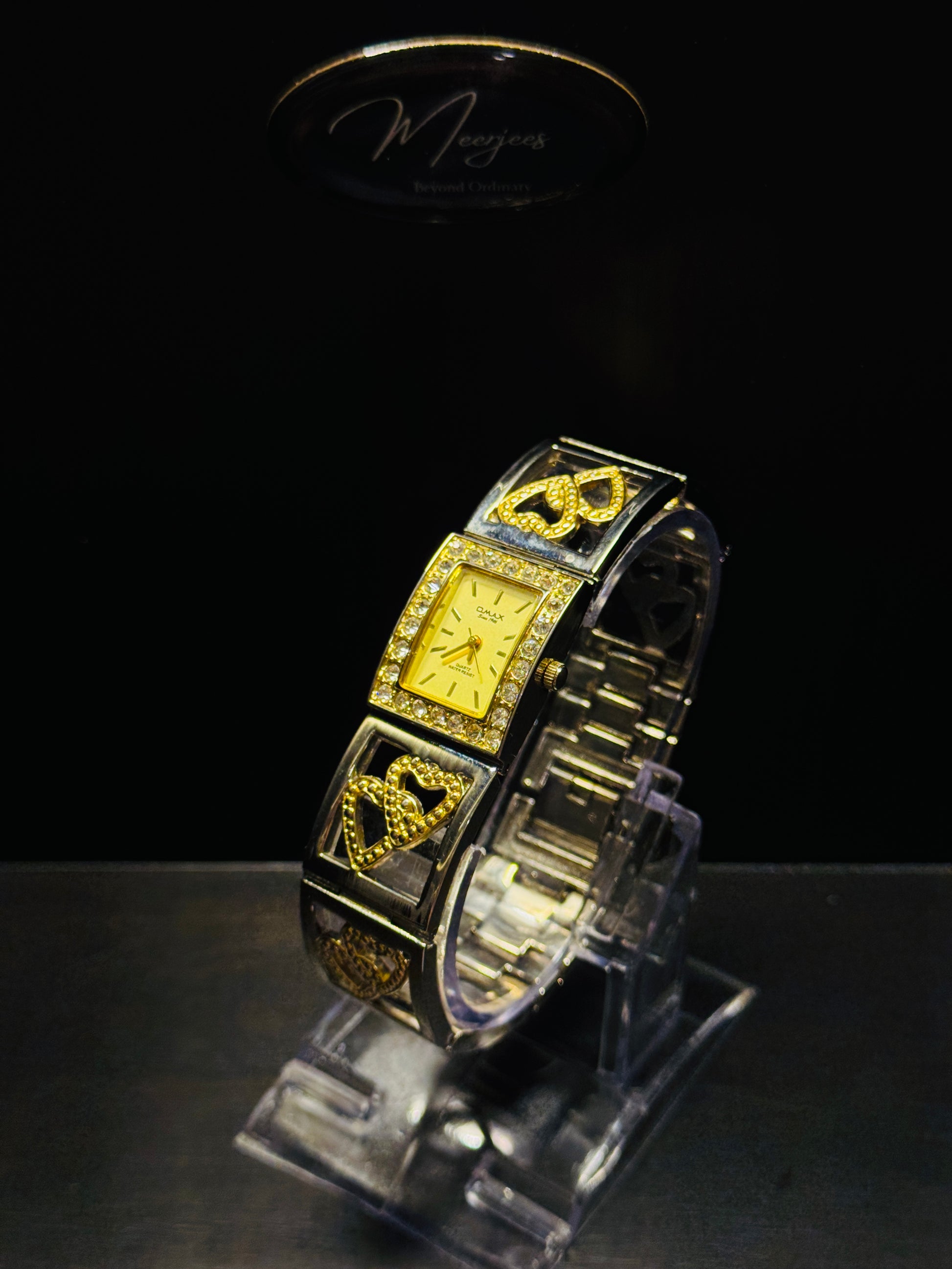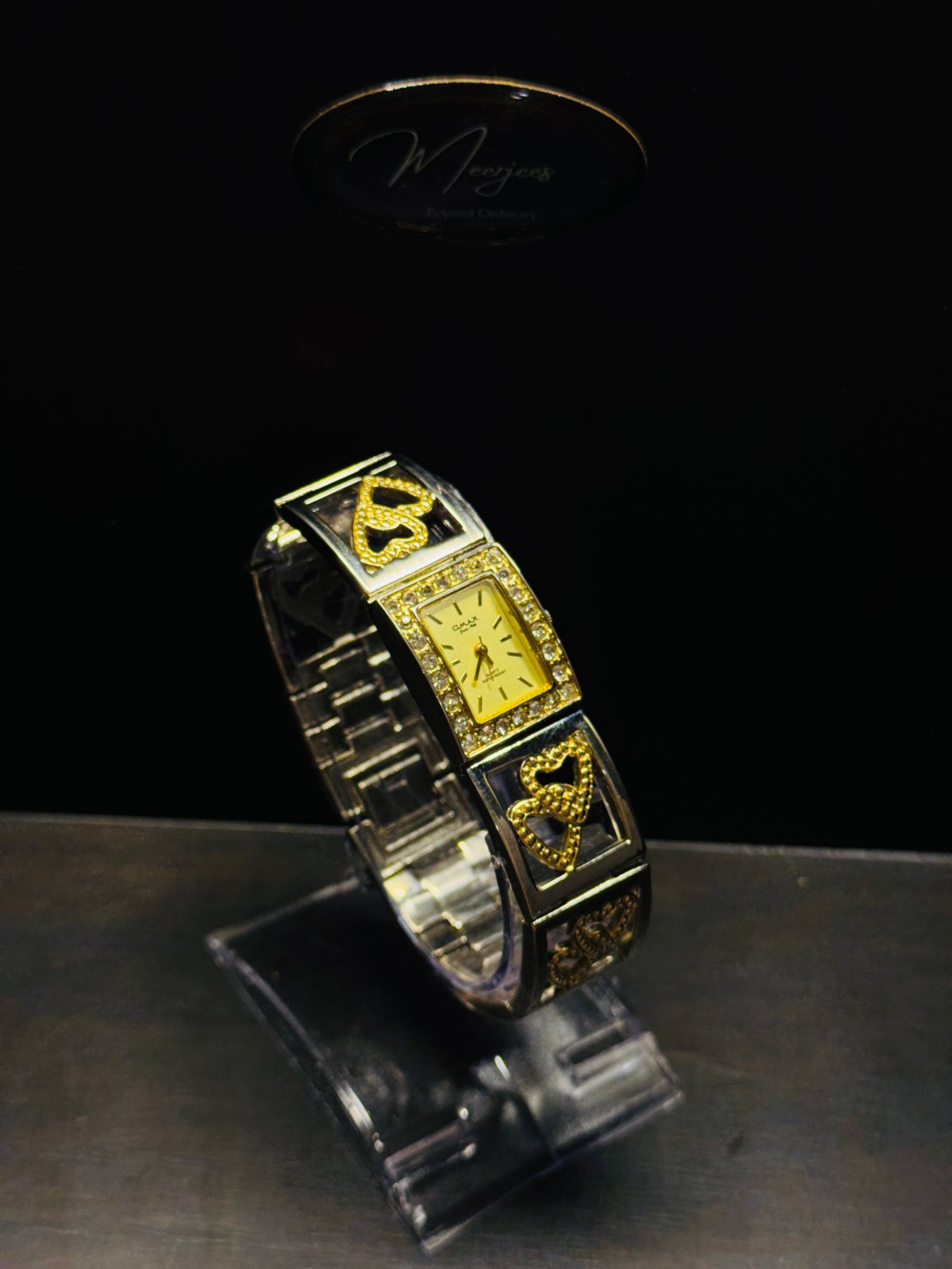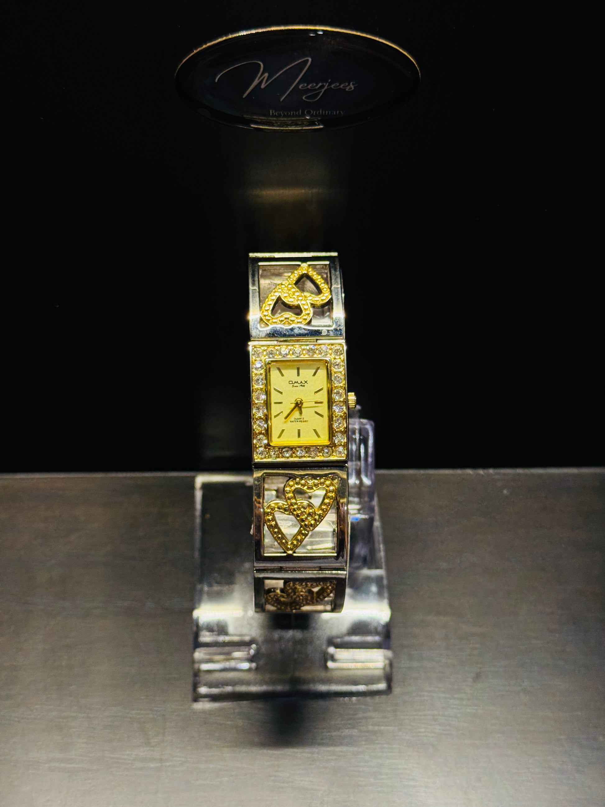 Charming and distinct, the Qmax Heart-Link Gold Elegant Love Edition is a true celebration of feminine grace. With golden heart motifs along the bracelet, a sleek rectangular dial, and delicate stone accents, this timepiece is made for ladies who wear their elegance effortlessly.